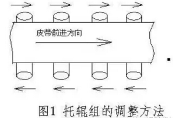 1 .調(diào)整承載托輥組 皮帶機(jī)的皮帶在整個(gè)皮帶輸送機(jī)的中部跑偏時(shí)可調(diào)整托輥組的位置來(lái)調(diào)整跑偏;在制造時(shí)托輥組的兩側(cè)安裝孔都加工成長(zhǎng)孔,以便進(jìn)行調(diào)整。具體調(diào)整方法(見(jiàn)圖1),具體方法是皮帶偏向哪一側(cè),托輥組的哪一側(cè)朝皮帶前進(jìn)方向前移,或另外一側(cè)后移。如圖1所示皮帶向上方向跑偏則托輥組的下位處應(yīng)當(dāng)向左移動(dòng),托輥組的上位處向右移動(dòng)。