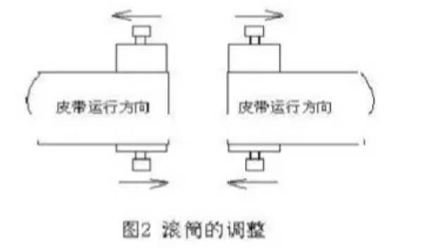3. 調(diào)整驅(qū)動(dòng)滾筒與改向滾筒位置 驅(qū)動(dòng)滾筒與改向滾筒的調(diào)整是皮帶跑偏調(diào)整的重要環(huán)節(jié)。因?yàn)橐粭l皮帶輸送機(jī)至少有2到5個(gè)滾筒,所有滾筒的安裝位置必須垂直于皮帶輸送機(jī)長(zhǎng)度方向的中心線(xiàn),若偏斜過(guò)大必然發(fā)生跑偏。其調(diào)整方法與調(diào)整托輥組類(lèi)似。對(duì)于頭部滾筒如皮帶向滾筒的右側(cè)跑偏,則右側(cè)的軸承座應(yīng)當(dāng)向前移動(dòng),皮帶向滾筒的左側(cè)跑偏,則左側(cè)的軸承座應(yīng)當(dāng)向前移動(dòng),相對(duì)應(yīng)的也可將左側(cè)軸承座后移或右側(cè)軸承座后移。尾部滾筒的調(diào)整方法與頭部滾筒剛好相反。調(diào)整方法(見(jiàn)圖2)。經(jīng)過(guò)反復(fù)調(diào)整直到皮帶調(diào)到較理想的位置。在調(diào)整驅(qū)動(dòng)或改向滾筒前最好準(zhǔn)確安裝其位置.